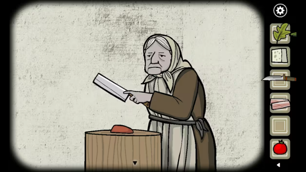 回到小屋,将胡椒、蘑菇和洋葱递给奶奶