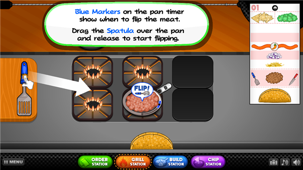 顾客进店后,先仔细听清他们的订单要求,把口味、配料这些信息记准确。接着到烧烤站,根据订单选择对应的食材开始煎烤。煎烤时得留意倒计时,当出现蓝色标记时,赶紧翻肉,要是翻晚了,肉就会烤焦,影响口感和评分。