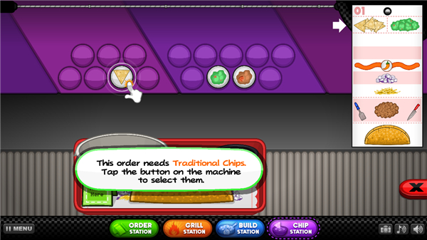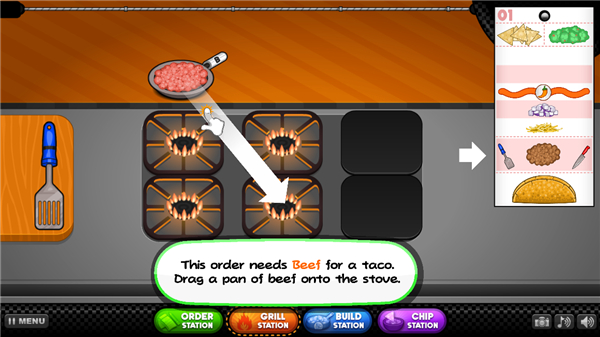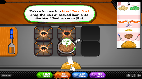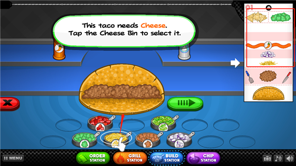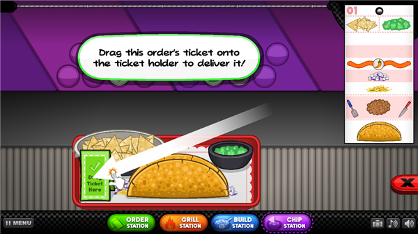 13、最后一步,将顾客订单拖放到绿色的位置,一份美味的塔可就出餐啦,赶紧送给客人品尝吧。