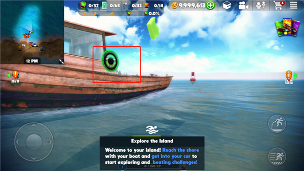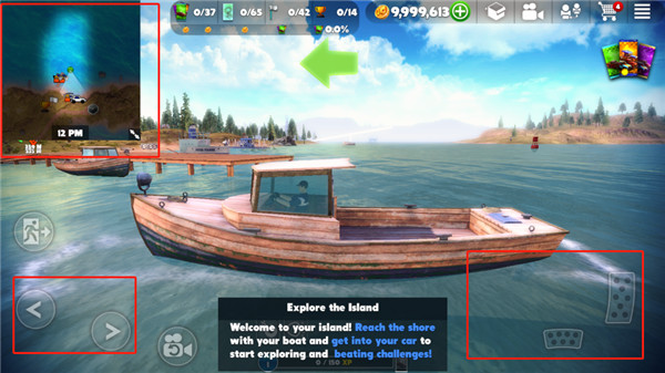 4、按照蓝色方向标的指引,把船稳稳地开到岸边。到了岸边,再通过点击操作上车,就可以准备在陆地上大展身手啦。