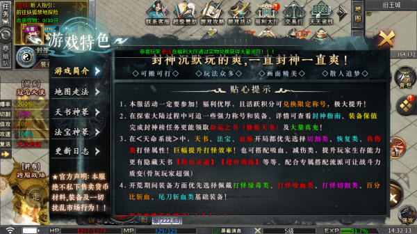 2、 本服部分特色玩法预告:天书、法宝、血脉、BOSS挑战、打怪抽奖、封神之章、隐藏路线、隐藏剧情、奇遇系统、限定装扮、特色众多就不一一赘述了!