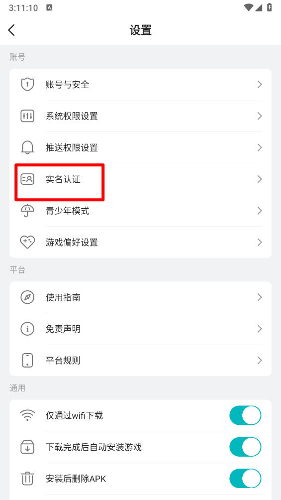 3、最后在设置页面,点击"实名认证"进入即可输入信息提交。