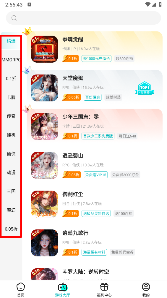 3、用户还可以在"游戏大厅"板块根据分类进行选择。
